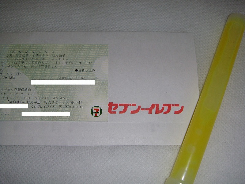 超ひだまつりZのチケットと、今はもう光り輝いていない緑のサイリウムです。